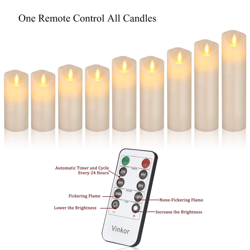 **Real Flame-effect Candles** These candles are so realistic that practically indistinguishable from traditional burning candles. Flame simulation technology makes the candles flickering, brings the most realistic experience to any room. **Real Wax & Elegant Design** The candle shell is made from paraffin wax, however there is no burning wick, smoke or messy dripping wax. They are perfect for places like bookshelves and bedrooms. Smooth finish, classic ivory color and elegant design, use the Real Flame- effect Candles in locations where you would use real candles. **10 Key remote control, Smarter Candle** Let the candles easy to operate, change what you want as the Manual. **Extended Lighting Time** Powered by 2AA batteries (not included), the expected battery life is of approx. 200 hours (high-grade battery required). **Package Include** 9 x Antizer Flameless candles(Diameter:2.2",2 x H 4", 2 x H 5",2 x H 6", 1 x H 7", 1 x H 8", 1 x H 9") 2 x 10 key remote control 1 x Spare parts of bottom cover 1 x User Manual **Note:** 1\. This candle is made of real wax and is flammable. Do not attempt to light this candle. 2\. Keep out of direct sunlight, away from heat sources and out of extreme temperatures or your candle may soften or melt. 3\. Constant use of the timer however may considerably reduce battery life.