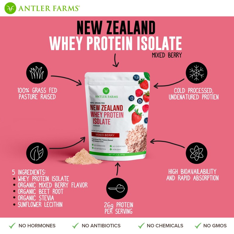 Antler Farms - 100% Grass Fed New Zealand Whey Protein Isolate, Mixed Berry Flavor, 30 Servings, 2 lbs - Delicious, Cold Processed, Rapidly Absorbed, Keto Friendly, NO-Hormones, NO-GMOs