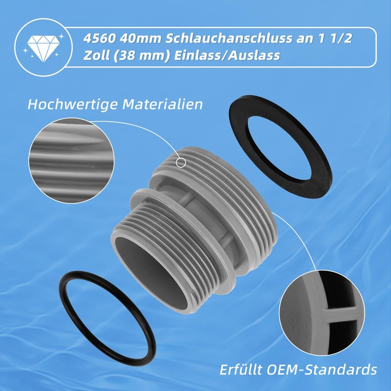 - Teilenummer #4560 40mm für oberirdische Poolpumpen:Der Poolfilterschlauch-zu-Filteranschluss-Adapter mit 40mm Außengewinde und einem 1 1/2-Zoll (38mm) Außengewinde ermöglicht die Verbindung von Intex- und Coleman-Bodenfilterschläuchen mit anderen Poolfilterpumpenmarken.Kompatibel mit 1 1/2-Zoll-Standardeinlässen/-auslässen.Ebenfalls passend für Bes'tway-Poolschlauchadapter.