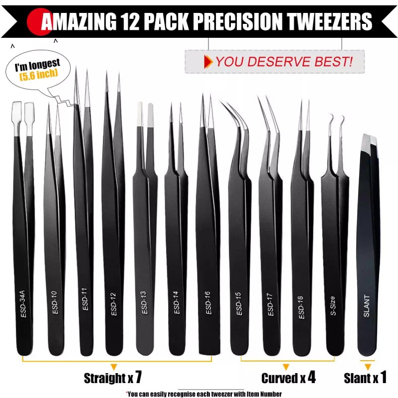 - Grab hold of whatever you want! This multifunctional tweezers set has 12 types of tweezers, which suit for Electronics Repair, Craft, Jewelry, Soldering, Lab work, Model making, Stamp or coin collecting, Weeding vinyl design, Ingrown hair removal, Eyelash extension, Eyebrow removal, Paper Sculptures, Embroidery, Phone repair, Watch repair, Cameo, Diamond Painting, eyeglass, apparatus, etc.