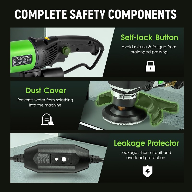 - Dust Free and Stable Operation: The wet polisher is equipped with a unique flexible splash guard for shock and dust protection. Features a 3-hole water distribution system for even wetting. With a seamless garden hose connection, this stone polishing machine ensures a healthy and safe work environment with smooth water flow and spill prevention