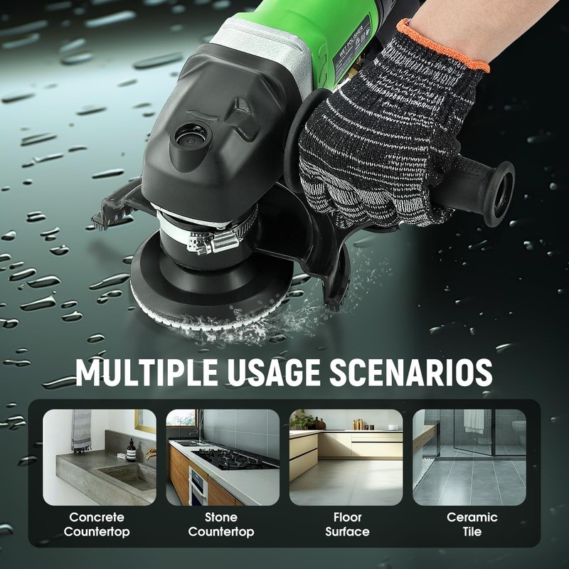 - Equipped with Everything You Need: The electric granite polisher kit includes 1* electric wet stone polisher, 1* self-adhesive polishing disc, 1* water shroud, 1* U-type auxiliary handle, 1* iron hoop, 7* wet polishing pads, 1* hex wrench, 1* wrench, 1* side handle, 2* carbon brushes, 1* ground fault circuit interrupter. This machine can satisfy all your needs and give you an excellent experience