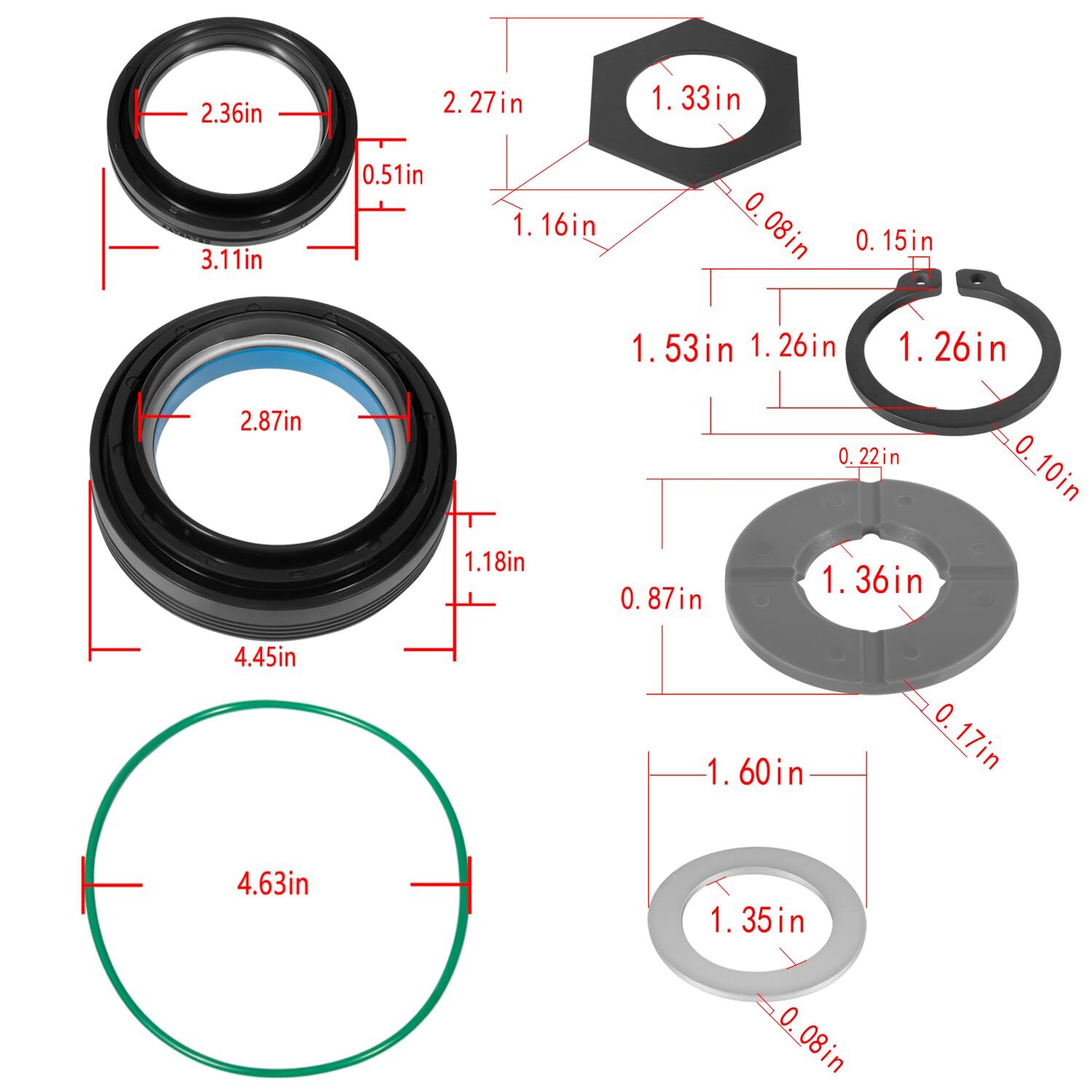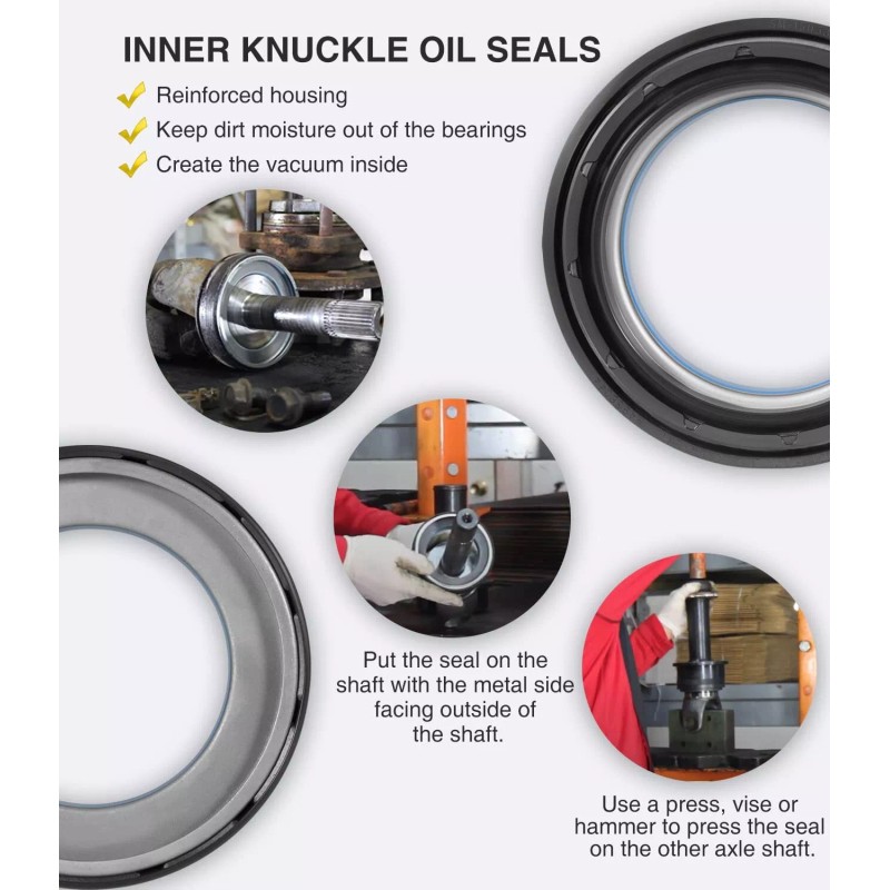 2.【Front Axle Knuckle Tube Seal Kit】 The front oil seal it features a precision seal design, prevents lubricant leakage and stops harmful contaminants from entering. High-quality material and reinforced housing helps prevent installation damage and increases effectiveness and ensures long-lasting use. Keeps your vehicle in top condition.