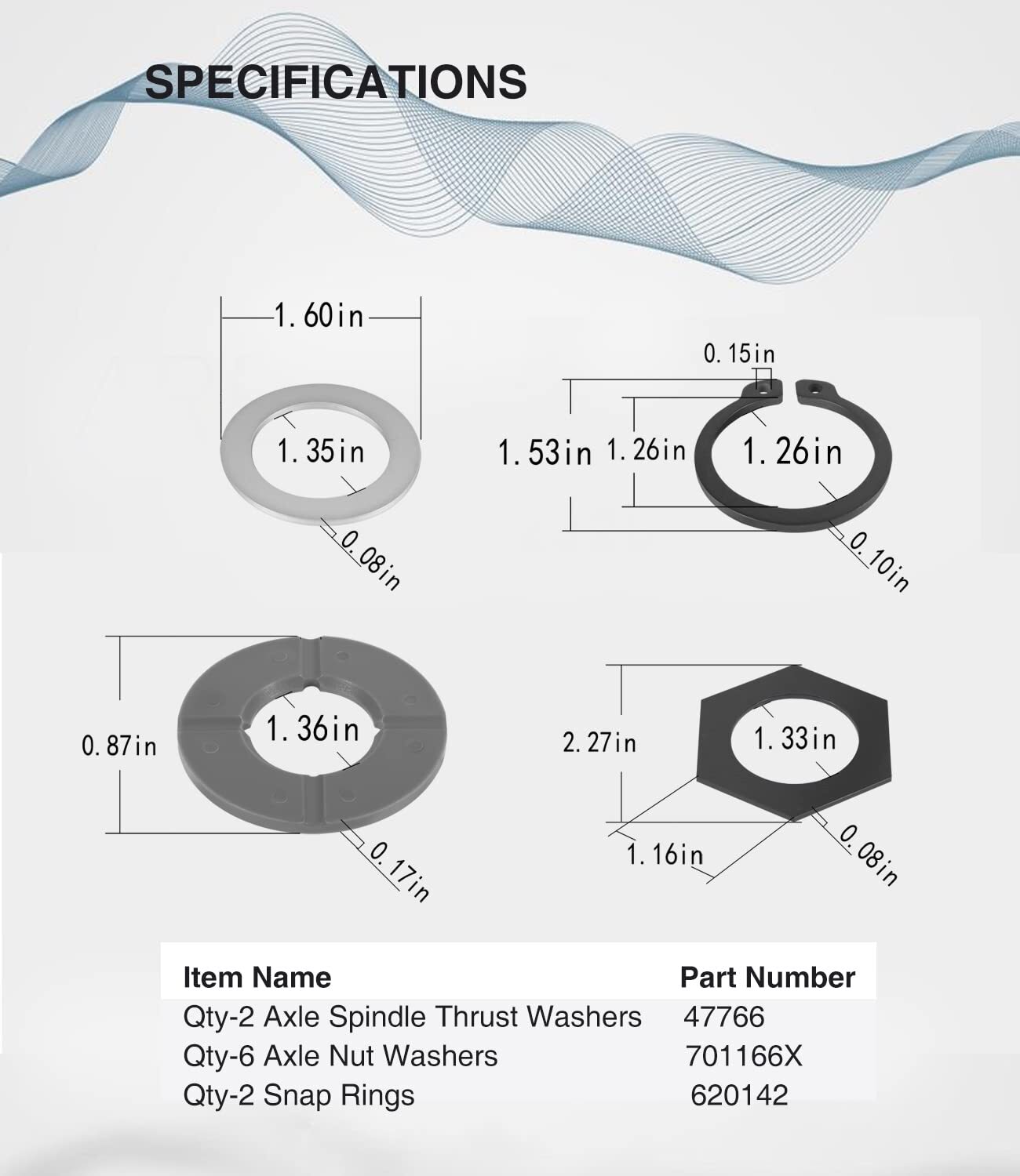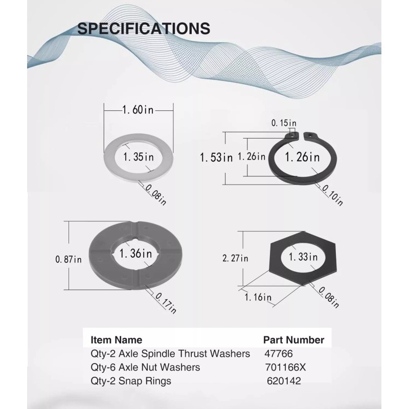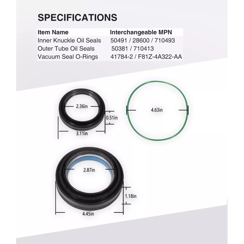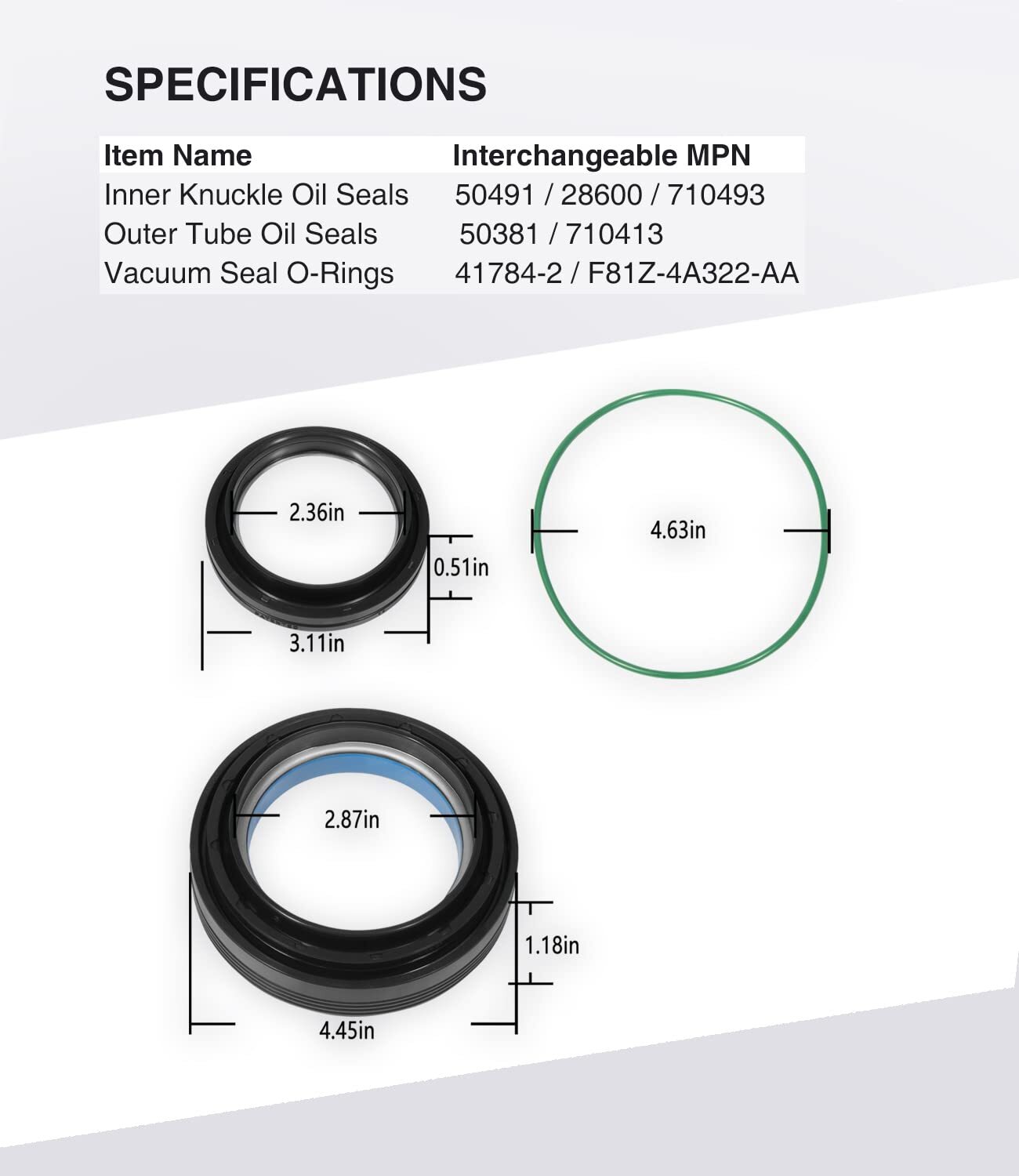 4.【Package Include】 ① The Thrust Washer Snap Ring Kit includes: 2 PCS Axle Spindle Thrust Washer (MPN: 47766); 6 PCS Axle Nut Washers (MPN: 701166X); 2 PCS Snap Ring (MPN: 620142). ② The front axle seal replacement kit includes: 2 PCS Inner Knuckle Oil Seals (MPN: 50491 / 28600 / 710493); 2 PCS Outer Tube Oil Seals (MPN: 50381 / 710413); 2 PCS Vacuum Seal O-Rings (MPN: 41784-2 / F81Z-4A322-AA)