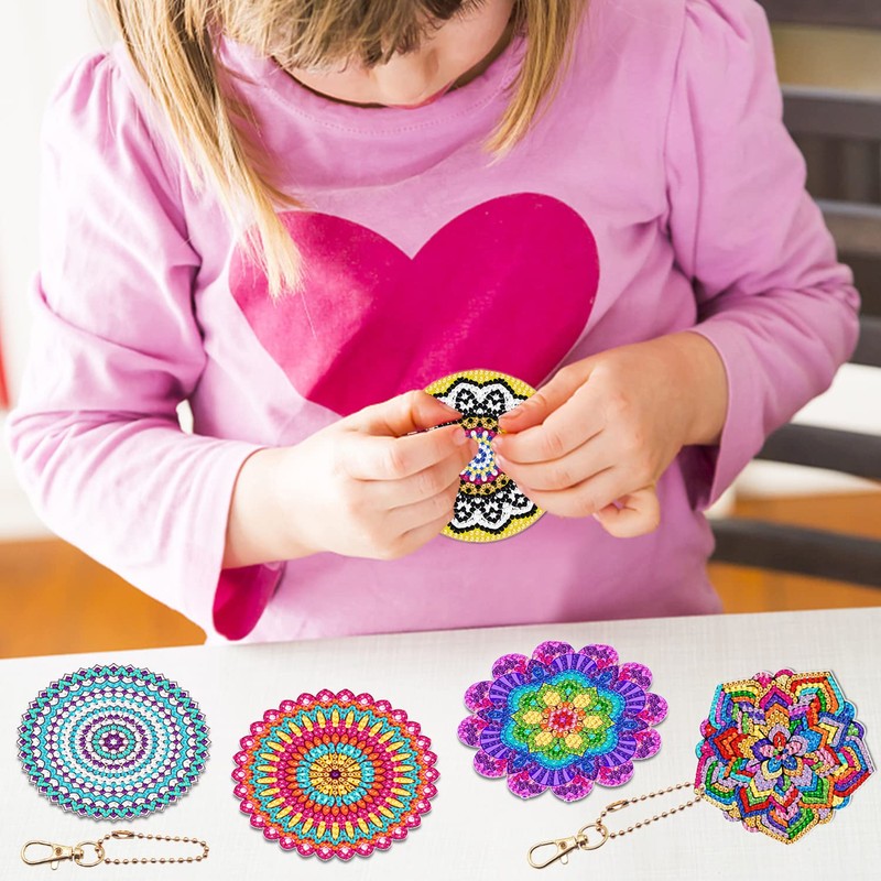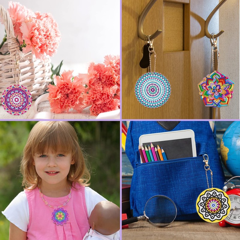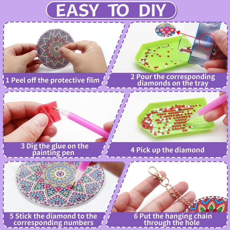 - PACKAGE INFORMATION- You will get 8 pcs diamond painting keychain pendants in different mandala themes, 2 diamond painting pens, 2 pieces of clays and 2 diamond painting trays, 10 self-sealing bags, 8 hanging chains. All accessory you need for making your own shinning key chain and extra painting tools to share with your family or friends