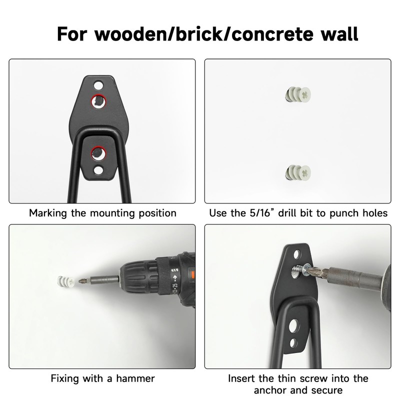 Easy to Install The garage hook is equipped with two kinds of screws and anchors, and is suitable for plaster wall, wood, brick or concrete wall, easy with drill, hammer and screwdriver.