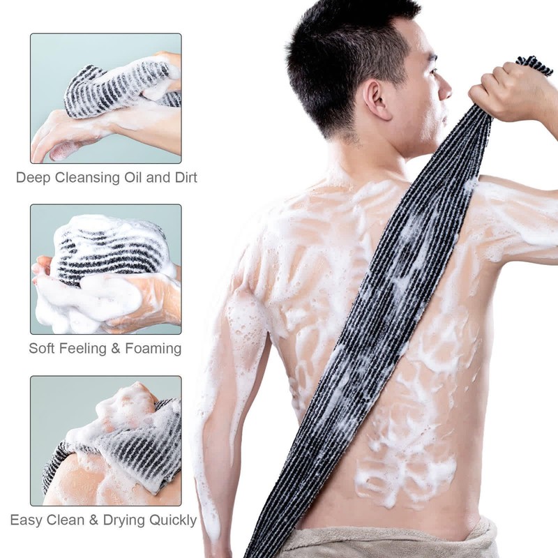 - EXFOLIATING SHOWER TOWEL CLEANING DIRT: t's extra long to let you scrub hard-to-reach areas like your back!Feel free to scrub your back from any angle, and it will never be difficult for anyone to scrub your back