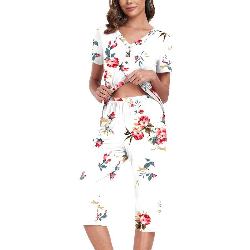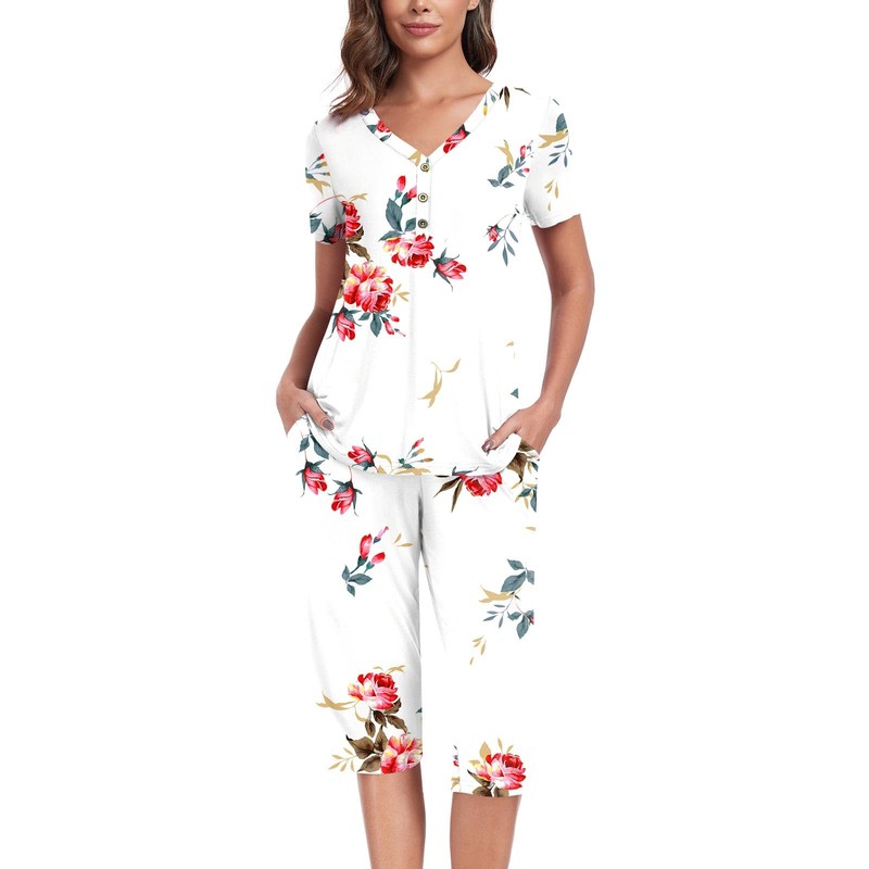 - ❤ 【Fashion & Comfy Design】Cute two piece outfits, short sleeve tops, soft nightwear, button down henley neckline design makes pj more stylish. Elastic waistband capri pants, casual and comfy, graceful and easeful. Two side pockets hold your belongings.This 2 piece pj sets nightwear sleepwear is perfect for women, juniors, ladies and teens.