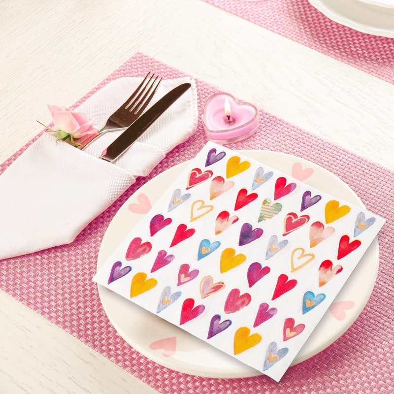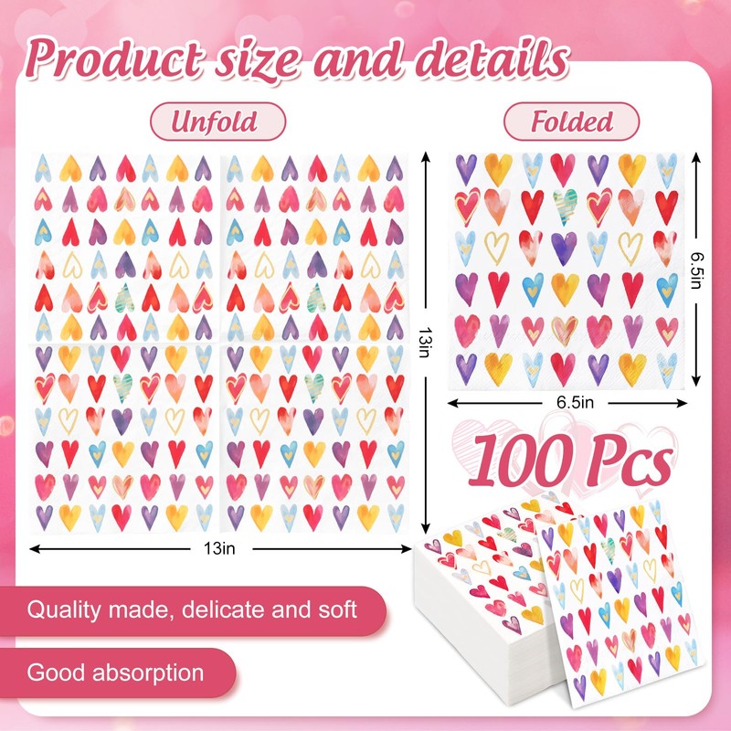 100 sheets luncheon napkins, patterned with colorful hearts, special and beautiful, suitable for many occasions.