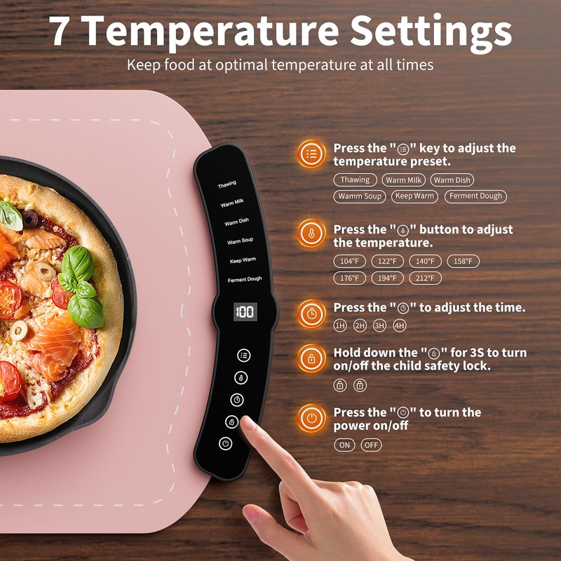 - Child Lock and Safety Function: Our food warmer is equipped with a child safety lock. Long press for 3 seconds to activate the child safety lock function to ensure that children will not accidentally adjust the Settings, so you can rest assured. If you forget to turn off the heating mat for food, the automatic shutdown function after 4 hours is a safety priority to ensure the safety of you and your family.
