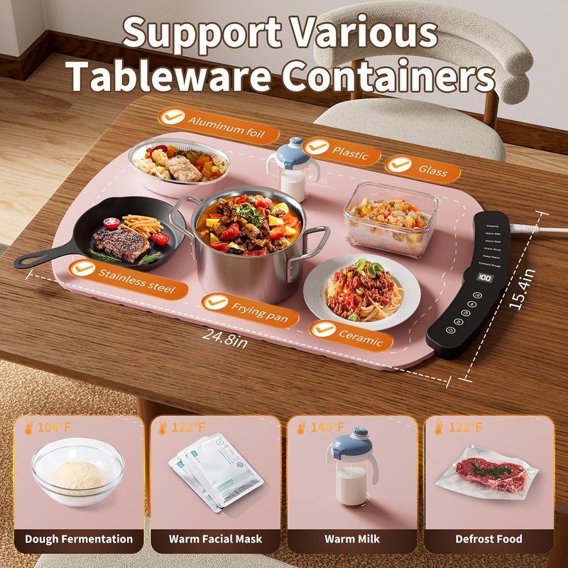 - Year-Round Multifunctional Use: It's suitable for family gatherings, summer outdoor picnics, buffets, and other occasions. A food heating mat can also be used to ferment dough and thaw frozen foods. Its set-temperature mode helps you better organize your time. It's a gifts for Mom to help her better prepare food for the family.