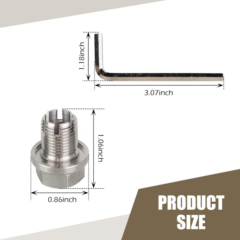 Package Includes: 1 stainless steel self tapping oversize oil drain plug 1 L shaped hex key Allen wrench 2 fluorine O rings and 2 red copper gaskets
