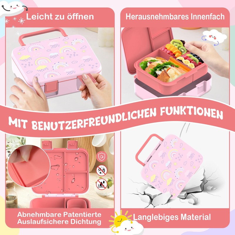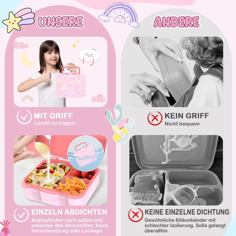 - 🌈 Doppelte Auslaufsicherheit – Kein Chaos mehr: Dank der patentierten Silikondichtung und den kinderfreundlichen Clips ist unsere brotdose kinder absolut auslaufsicher. Sie hält Lebensmittel frisch und verhindert das Verschütten während des Transports. Selbst bei einem Umkippen bleibt jedes Fach sauber und ordentlich.