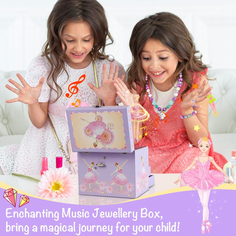 - 🎵Ballerina Musical Box: Open up the enchanting jewellery box, and your little one will delight in the sight of a graceful dancing ballerina to enchanting melodies. The unique swan lake and ballerina design of our girls jewellery box will create a magical experience for your child and fill them with joy.