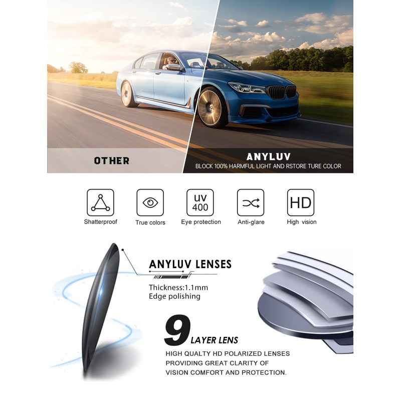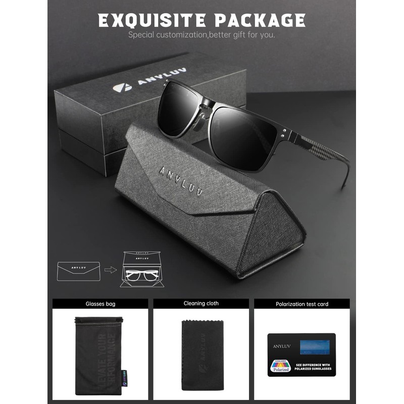 - 【After-Sales Brand Service 】Gift packaging:Sunglasses*1, Glasses Case*1, Microfiber Glasses Cleaning Cloth*1, Packaging Box*1. It also comes ready-to-gift-wrapped, making it a wonderful and functional gift idea for friends and family! ANYLUV attach great importance to product quality and customer satisfaction. Each ANYLUV customer can enjoy after-sale brand service for our polarized sunglasses. Please feel free to contact our customer service if you have any product problem.