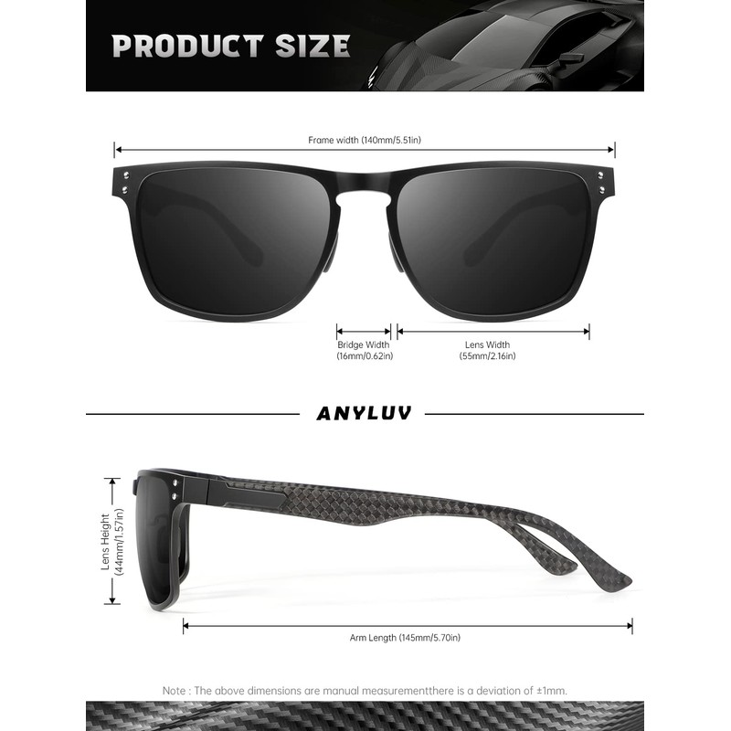 - 【Mens Sunglasses Polarized UV Protection Lens】The lens of the carbon fiber mens sunglasses polarized are made of high grade material and polarized coating, can block UV400 light and harmful Light, eliminate reflected light and scattered light, ensure the clear sight, restore true color, carefully protect your eyes. ANYLUV mens sunglasses block the glare of the sun, make your eyes more comfortable make you look more energy.