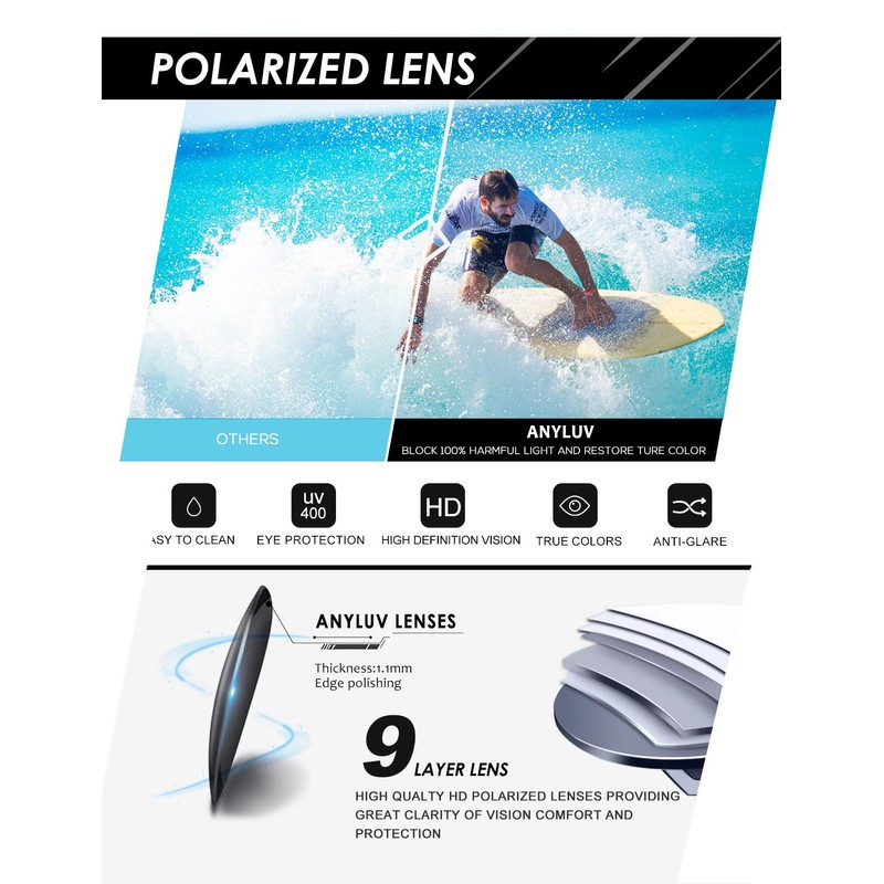 - 🔷 Retro Square Style➢ANYLUV men's sunglasses feature a classic wide square frame with polarized lenses, offering a timeless look that complements any outfit year-round.