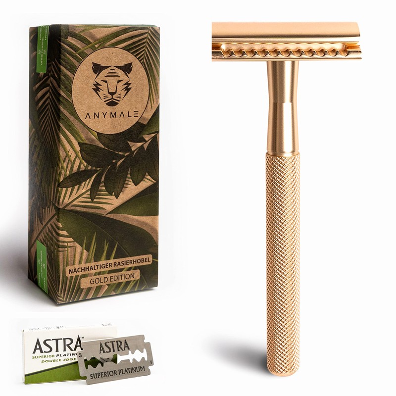 ANYMALE® Safety Razor Gold Edition - Includes 5 Astra Blades - Plastic-free Women's Razor Made of Metal