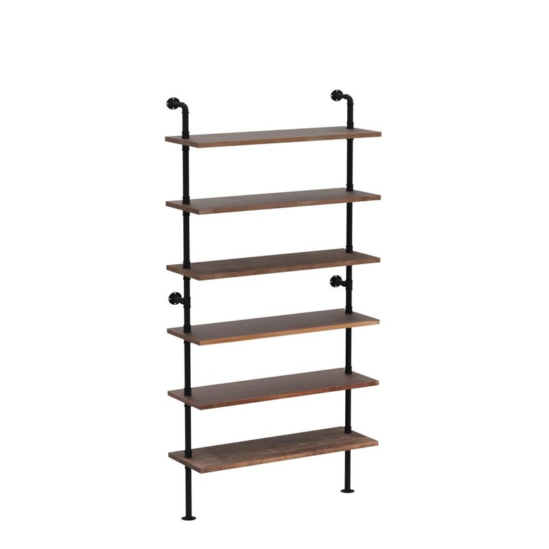 A great way to save space and add style to your living room or dining area, this versatile wall mount ladder bookcase fits perfectly in any corner. Crafted from metal, its two-beam frame gives this piece a sleek look that mimics iron piping, while the wood-style book shelves with a ladder design adds a touch of traditional flair. More than just a stylish accent piece, this bookcase features 6 shelf stand crafted from real wood wood that holds all your favorite items while also acting as a space-saver to help clear up the clutter. Wall mounting hardware is included.