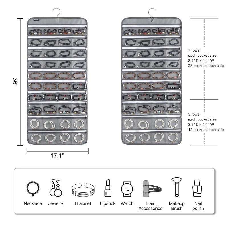 Try to use our ANZORG Dual-sided Hanging Jewelry Organizer with Zippered Pouchesto quickly see and pick all your jewelries:
