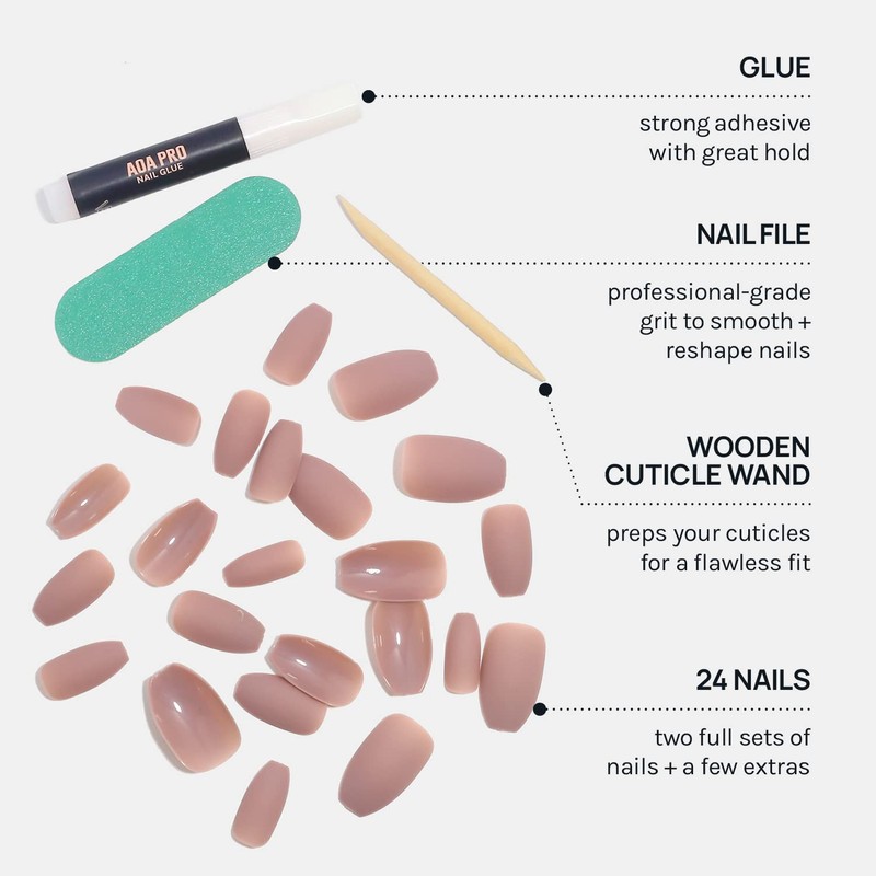 - 💖Kit Includes 24 nails, nail file, glue, and wooden cuticle wand