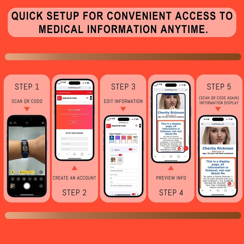 - Medical Emergency Information:Our bracelet features innovative QR code technology to store extensive medical details, far surpassing traditional engraved tags. Simply scan the QR code to access a comprehensive emergency medical profile for quick and accurate information retrieval;