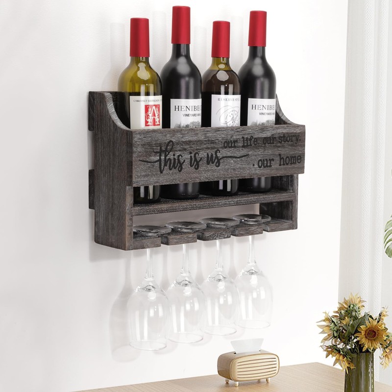 - Wall Mounted Wine Racks:Wall mount design keeps bottles and stemware glasses off countertops,Wine glasses hang upside down under the ledge to stay dust free and within reach.Simply mount this hanging wine rack to wall with little effort