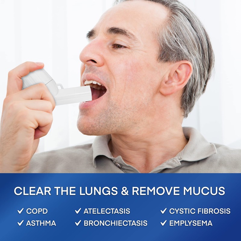 - Relieves mucus, breathes better – by vibrating to release mucus from the airways and creating pressure to keep the airways open, the device helps remove mucus from your lungs.