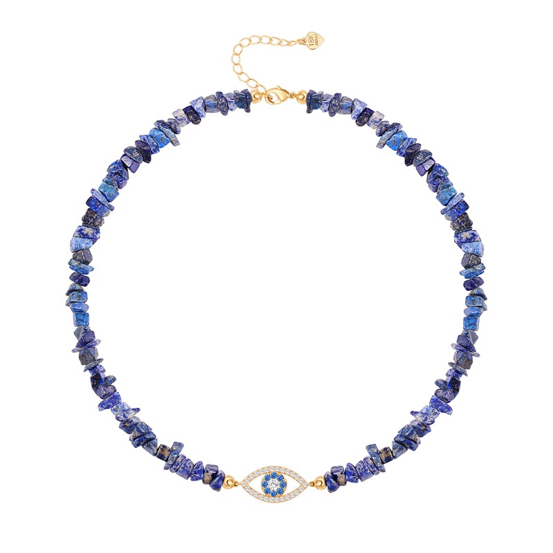 - 【Lapis Lazuli Necklace】The fashion gemstone necklace is made of lapis lazuli gravel stones, a 11mm*20mm cubic zirconia blue evil eye charm and a 18k gold plated lobster clasp & extender chain. Total length of the blue evil eye choker necklace is about 15” ( equals 38cm ), matching a 2” ( equals 5cm ) extender chain to fit most necks’ sizes. The 15” short choker features irregular lapis lazuli beads for unique style.