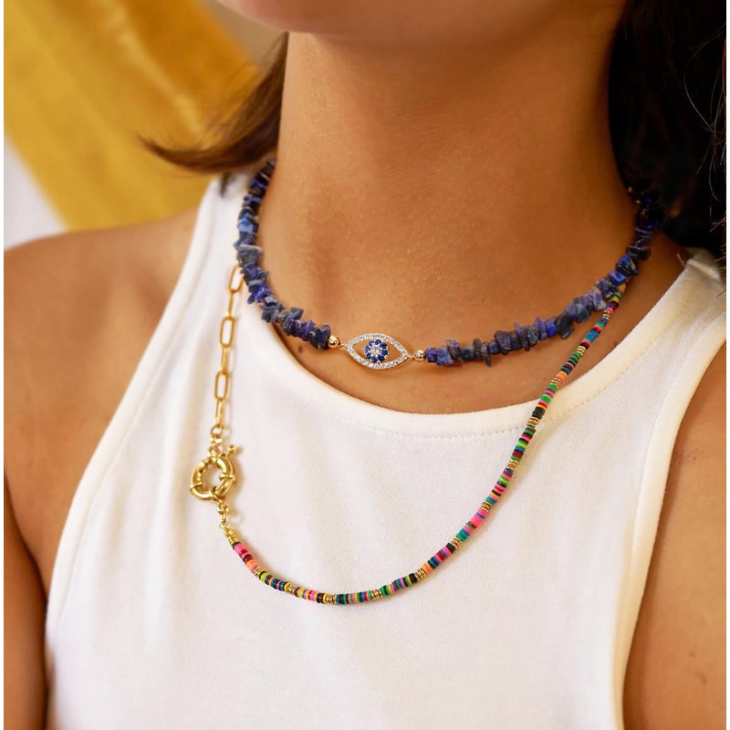 - 【CZ Evil Eye Necklace】You may be attracted by the semi-precious stone necklace because the shiny cubic zirconia paved evil eye charm, chic and personalized. The evil eye pendant necklace represents protection to prevent hurt and bring luck to the one you loved. The tumbled chip stone necklace can increase your charm. Irregular lapis lazuli beads, strung on the golden steel wire, let the boho necklace be durable. The short gemstone beaded necklace makes you be eye-catching on any occasion.