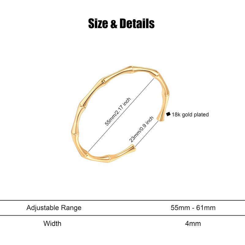 - Suitable for Most: The bamboo style gold bangle makes a dazzle, the glossiness of this cuff bangle makes it glittering under the sun. The overall design is simple and unique which suitable for most buyers. Bamboo bracelet size is inner diameter 56mm, width 4mm; Bendable cuff open size can be easily adjusted to fit most wrists; Practical open bangle bracelet design, convenient to put on and take off. The adjustable bangle bracelet is sturdy which can be adjusted to your preferred size.