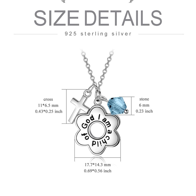 - March Birthstone: This is a girl's sterling silver necklace that holds a beautiful cross pendant and a daisy pendant with an adorable birthstone. Birthday gifts, baptism gifts, communion gifts, and first confirmation gifts for girls