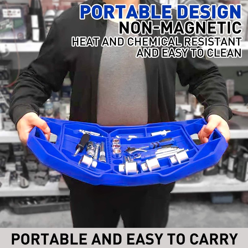 High EfficiencyThis non-slip, flexible tool tray set effectively organizes your tools. Fasteners, hammers, wrenches, sockets, drill bits, nuts, bolts and other tools are held in their designated areas, promoting an orderly work environment and improving work efficiency.Wide ApplicabilityDue to the high heat resistance and flexibility, this tool tray set is suitable for various working environments. It is non-magnetic and will not attract metal chips.Heat Resistant & Stain ResistantThis tool tray set demonstrates excellent heat resistance. It resists oil and non-corrosive chemicals, able to withstand substances like brake cleaner, gasoline, engine oil, and more.Easy to CleanCleaning is effortless with a damp rag or soapy water.More FeaturesThis tool tray set is lightweight, easy to carry and store, anti-static, non-magnetic, and non-flammable.