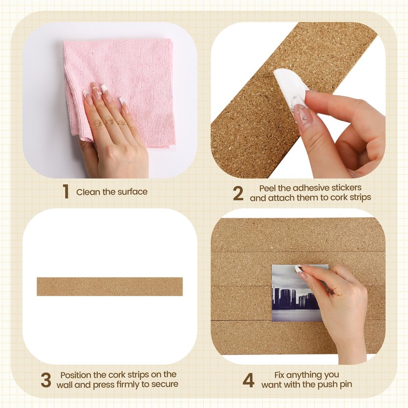 - Simple Application Process: simply peel off the double-sided adhesive sticker and attach it to the back of the cork board, then easily adhere the cork strips to walls or doors; the adhesive sticker won't easily fall off, and it leaves no residue on the wall when removed; displaying information with push pins becomes straightforward, helping you organize efficiently