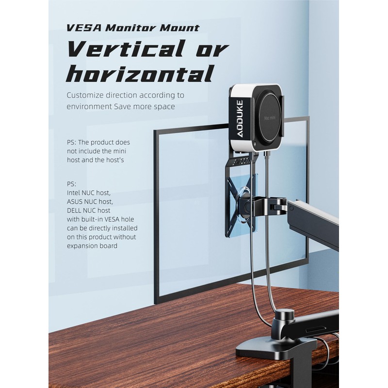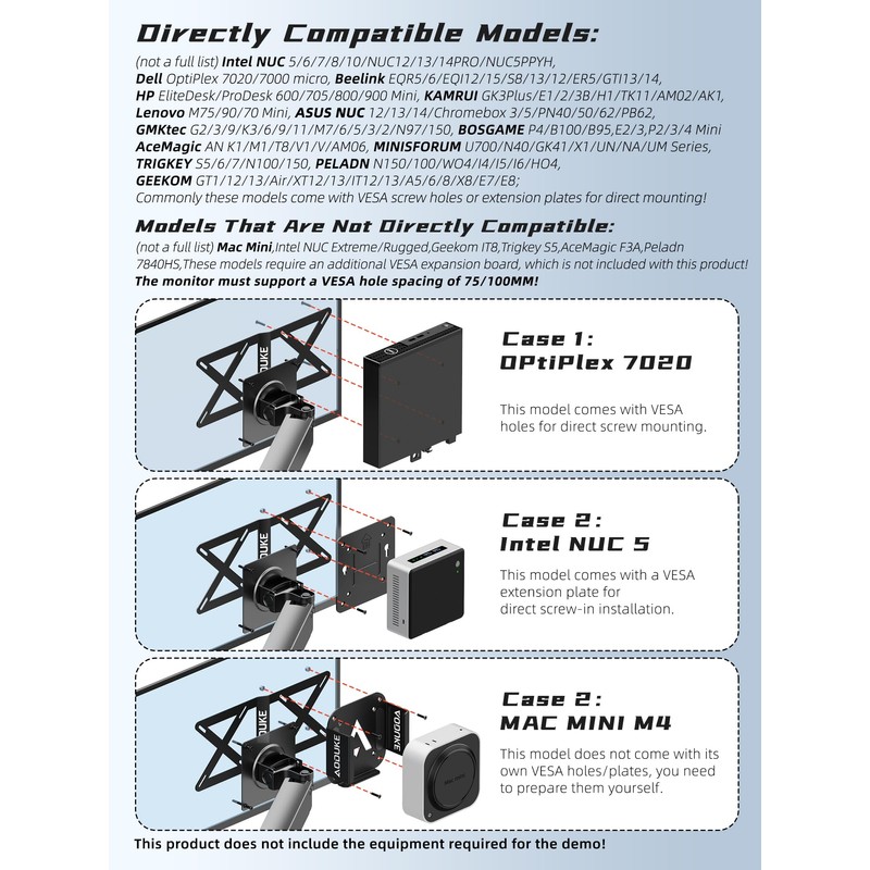 - 5. Can not be directly compatible with the device: (not a full list) Mac Mini, In tel NUC Extreme/Rugged, Gee kom IT8, Triziy S5, Ace Magic F3A, Pel adn 7840HS common these models do not have VESA holes need to be additional with the expansion board, this product does not contain! This product does not include the expansion board, if you need to use it, you need to prepare it by yourself