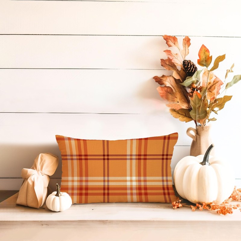 - The pillows feature a classic plaid design in a warm palette of oranges and browns, capturing the essence of the fall season.