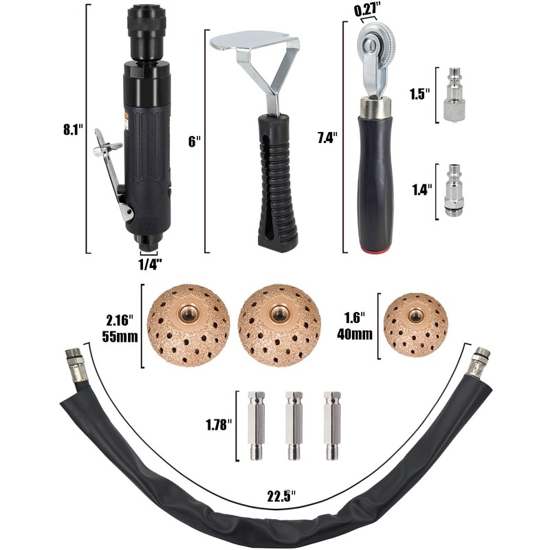 - 【Multi-Scenario Application】Suitable for all types of tires (cars, ATVs, tractors, RVs, trucks, motorcycles, etc.). Tire repair kit: 1 x Low-Speed Air Grinder, 1 x Air Pipe, 2 x Air Intake Connector, 3 x Tungsten Steel Grinding Heads, 3 x Coupler, 1 x Tire Patch Roller, 1 x Tire Inner Liner Scrapper.