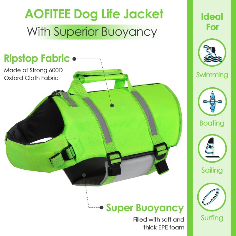 - Superior Buoyancy Dog Life Jacket: AOFITEE life jacket for dogs consist of durable Nylon and Oxford cloth, combined with high-density pearl cotton foam, to create sturdy and durable life jackets. Lightweight and comfortable, tear-resistant and waterproof properties, which are designed to provide excellent buoyancy support for your dog in the water