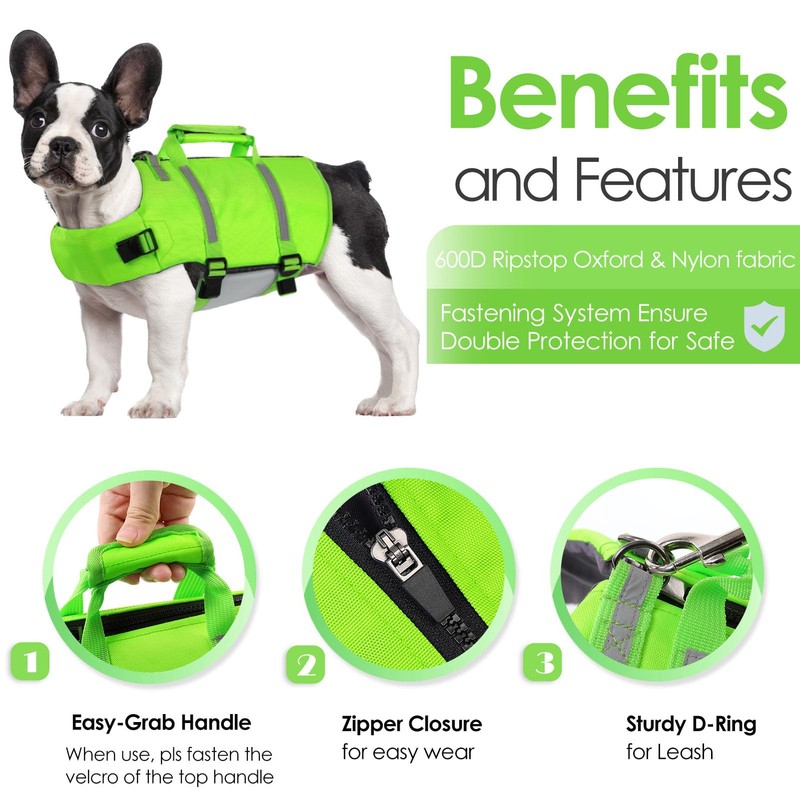 - Top Grab-Handle and Sturdy D-Ring: The small dog life jacket with a sturdy grab handle, not only useful in emergency rescue, but also perfect for grabbing the handle to assist dogs in learning to swim. Additionally, the heavy-duty D-rings for leash is added at the top of the dog swimsuit