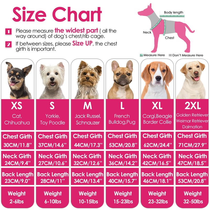 XXL-Back Length: 20.8"/ 53cm, Chest Girth: 27.9"/ 71cm, Neck Girth: 18.5"/ 47cm Recommend Weight:32-50bs