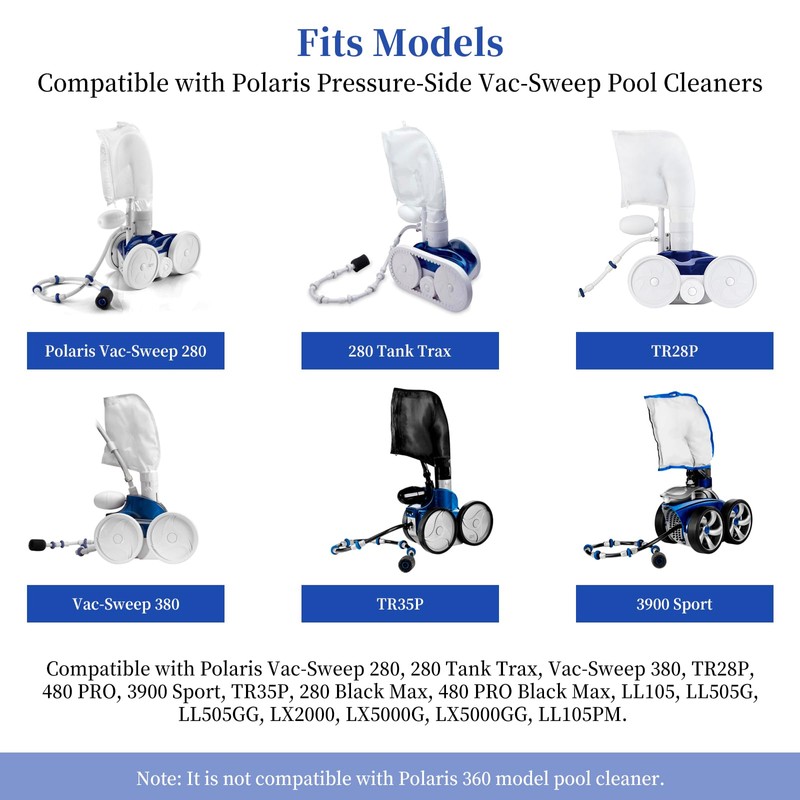 - 【Fits Models】The sweep hose tail complete is compatible with Polaris pressure-side vac-sweep pool cleaners. Models: ① Polaris 280, 280 Tank Trax, 380, TR28P, and 480 PRO. ② Polaris 3900 Sport, TR35P, 280 Black Max, 480 PRO Black Max. ③ LL105, LL505G, LL505GG, LX2000, LX5000G, LX5000GG, LL105PM. Note: It is not compatible with Polaris 360 model pool cleaner.