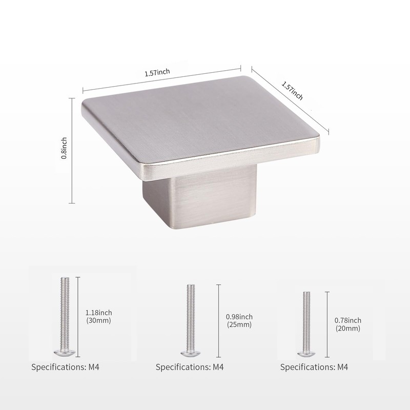 - CABINET PULL - PHYSICAL DIMENSIONS: 1. Pull center hole: single hole pull 2. Overall length 1.57 inches (40 mm) 3. Width 1.57 inches (40 mm) 4. Height: 0.8 inches (20 mm) 5. 3 sets of screws are available, screws length 0.8 inches (20 mm) 1.0 inches (25-mm) 1.2 inches (30 mm) Product and screws are packaged separately. The product and screws are packaged separately and will fit most surplus cabinet and drawer doors.