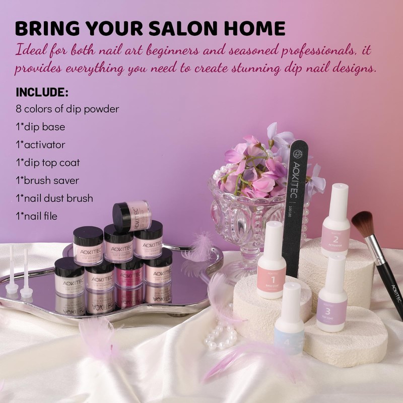 - Pink Series Dipping Powder Starter Kit - Aokitec all-inclusive dip powder nail kit comes with 8 vibrant dip powder colours, dip base/activator/top coat/brush saver, and basic nail tools(nail file, nail dust brush). Ideal for both nail art beginners and seasoned professionals.
