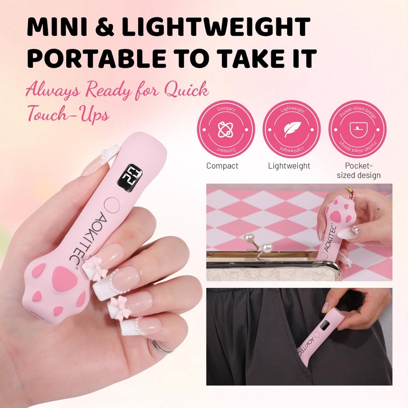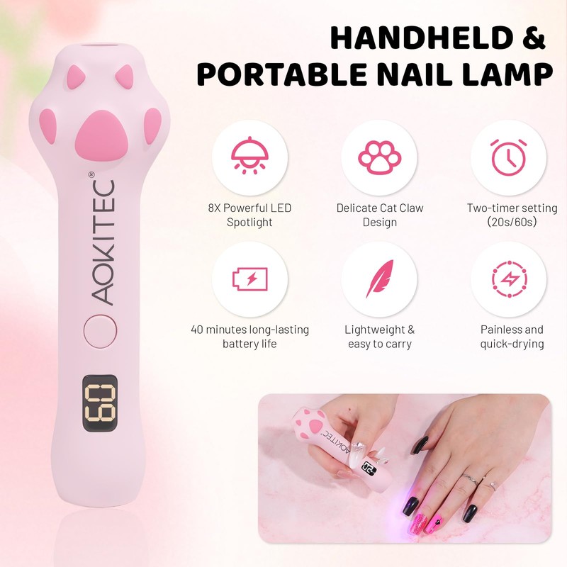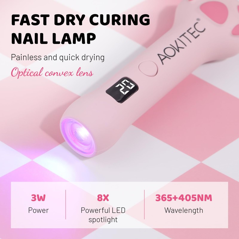 - 【Tragbare UV LED Nagellampe in Katzenpfotenform】Die Mini UV Lampe Nägel von Aokitec in Katzenpfotenform vereint Mode und Leistung. Sie verwendet fortschrittliche 365 nm + 405 nm Dual-Wellenlängen-LED-Lampenperlen und einen 8-fach konvexen Linsenstrahler, der für schnelles Trocknen der Nägel sorgt.