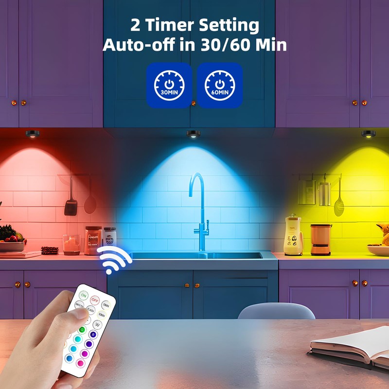 - Remote & Manual Control: The under cabinet lights with control allowing you to control color, brightness, and timing from up to 20 feet away. You can also manually press the light—short press for on/off and change through 4 colors, long press to adjust brightness