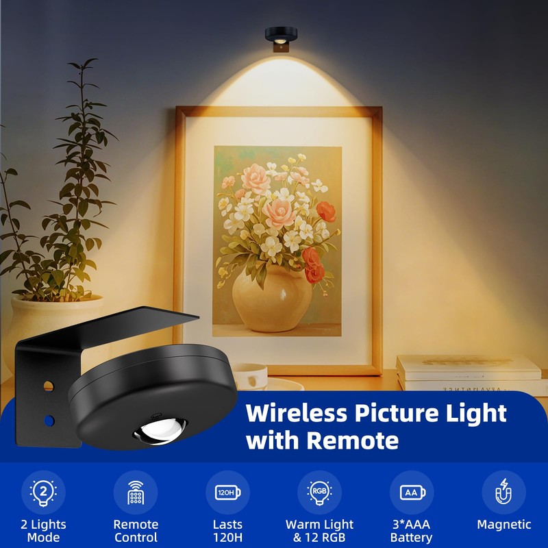 - 2 Lighting Modes & 13 Colors: The magnetic picture light can choose between steady (single color), smooth (cycles through 12 colors), or flash (gradual brightness change in one color). Includes warm white (3000K) and 12 vibrant color options to set the perfect mood