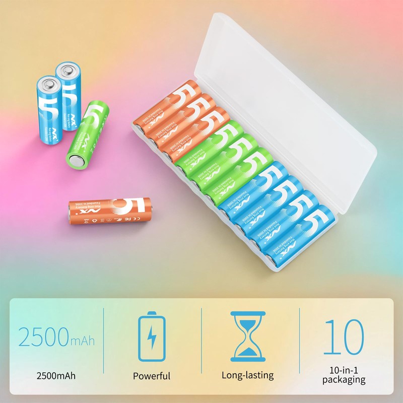 Aolcev AA Batteries Rechargeable 10 Pack Double A Battery 2500mAh 1.5V Ni-MH Set Batteries for Remote Controls Keyboards Clocks Kids Musical Mat Toys (AA 2500mAh 10 Pack, 3 Colors
