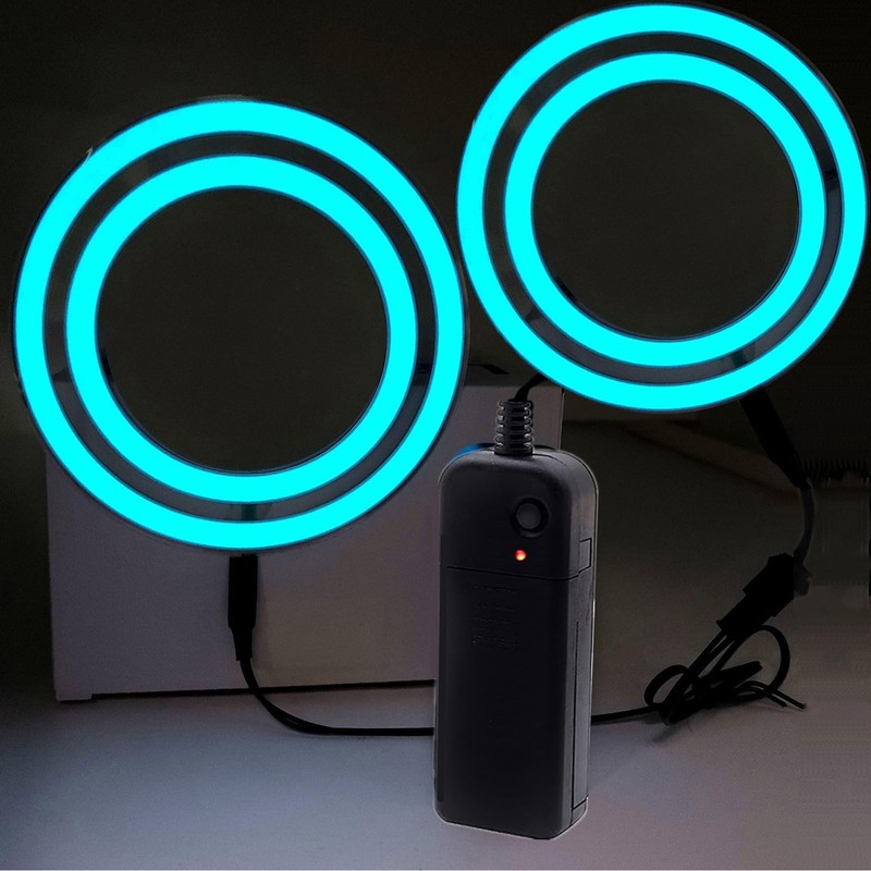 - ★【EL panel specifications】Inner diameter: 3.1 inches (8 cm), Outer diameter: 5.1 inches (13 cm), Emitting ring width: 0.4 inches (1 cm), Compatible voltage: 3V; Power supply: 2 x AA batteries (not included). Need to purchase separately.) Body Color: Green Emitting Color: Blue Package Includes: 2 x Organic EL panels, 1 x 2 branches of wire, 1 x Power supply unit