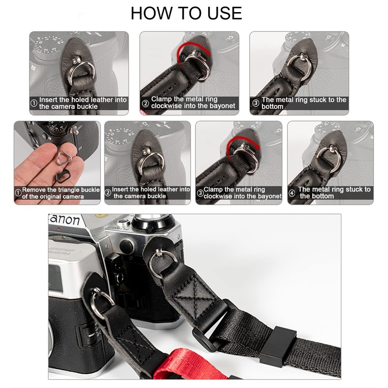 - SAFETY : Our camera straps are made of Premium Microfiber Leather on both ends and secured with multiple layers of stitching and copper nails in the middle,so they won't break even under a 22-pound pull. Once secured to the camera, you will not need to worry about the camera falling