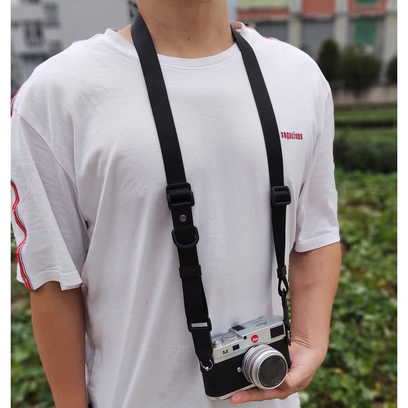 Thanks to the connecting ring, the carrying strap can also be attached to bodys with small eyelets, such as with retro or micro single cameras. In addition, it fits on mirrorless MFT, up to large full-frame DSLR cameras of various brands.